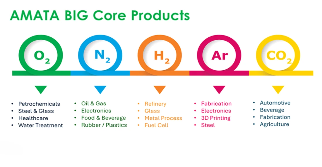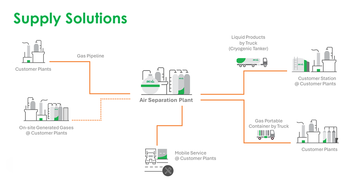 supplies a wide range of industrial gases to industrial estates by on-site gas generators, pipeline networks, bulk storage facilities, and gas separation plants.
